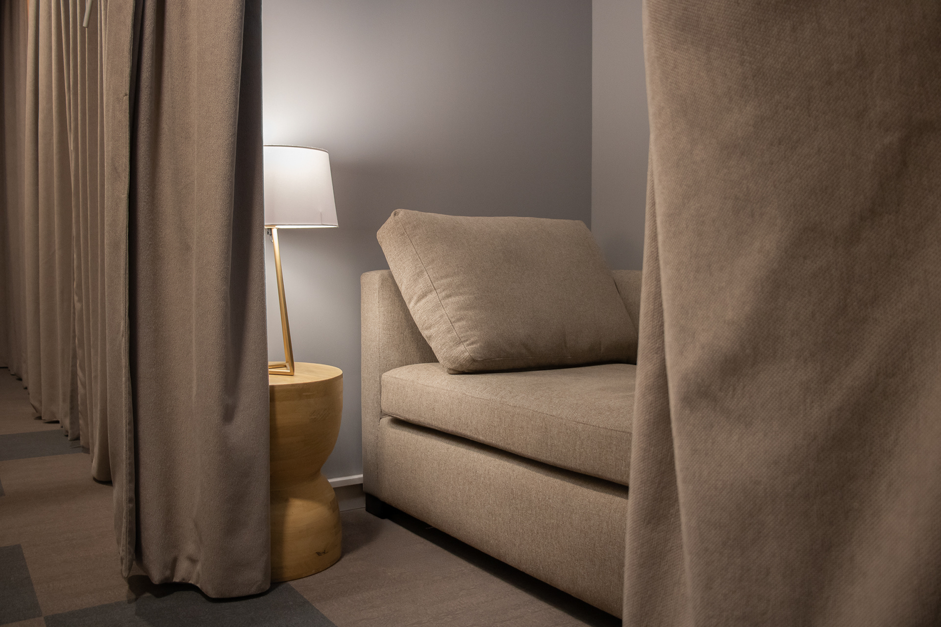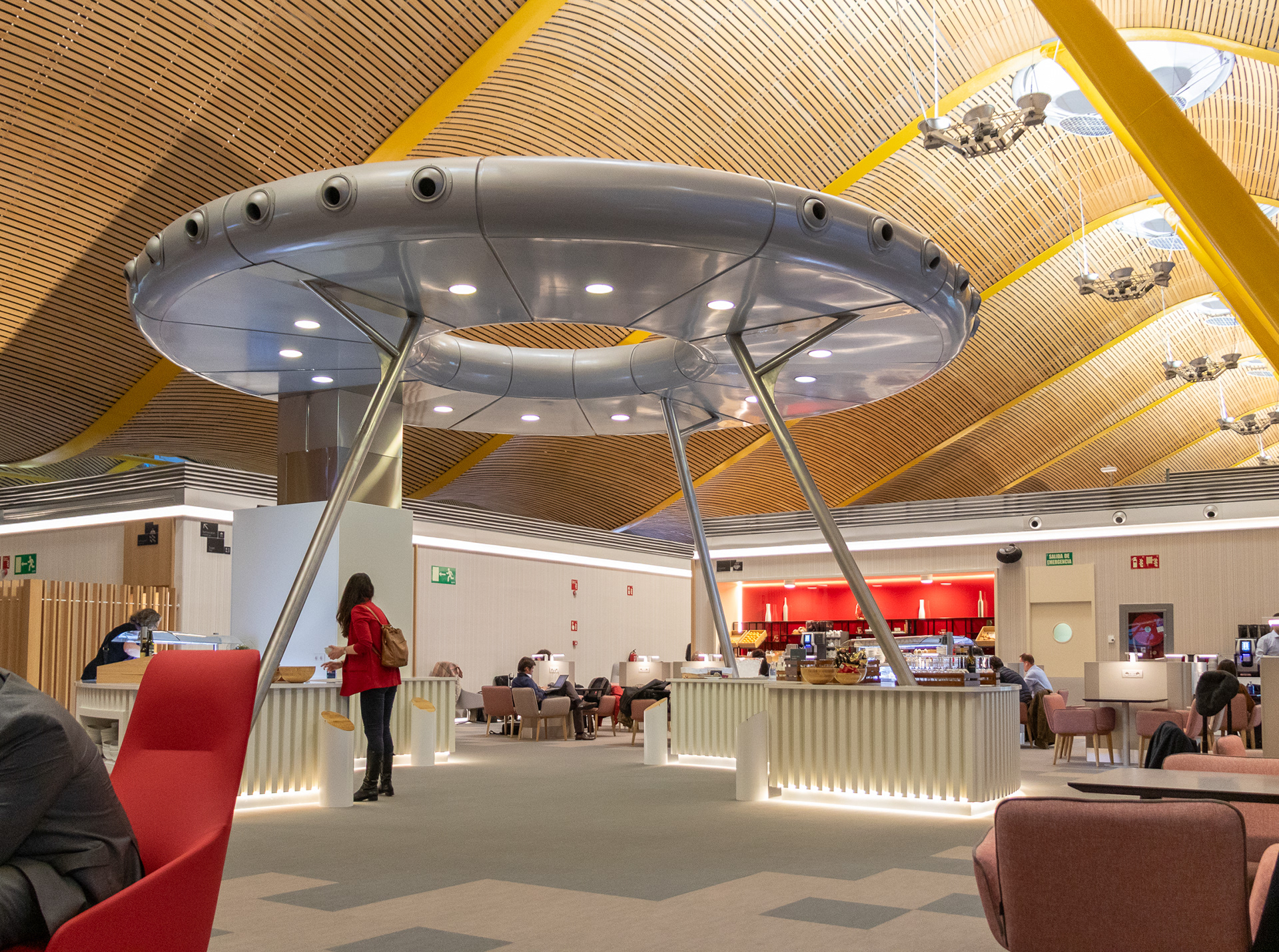 Se ha reestructurado la zona central, así como situado toda la zona de autoservicio alrededor de los "platillos volantes", elementos preexistes y diferenciales que presiden la sala y albergan los conductos de climatización. A su vez, se han ampliado servicios como baños, duchas y camas, así como conexiones USB, enchufes y wifi para comodidad de los clientes.